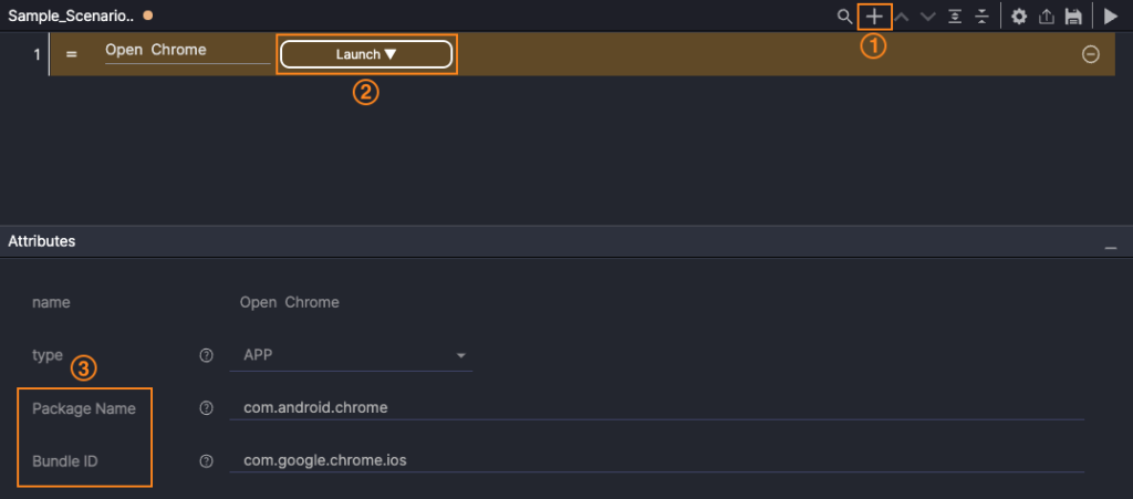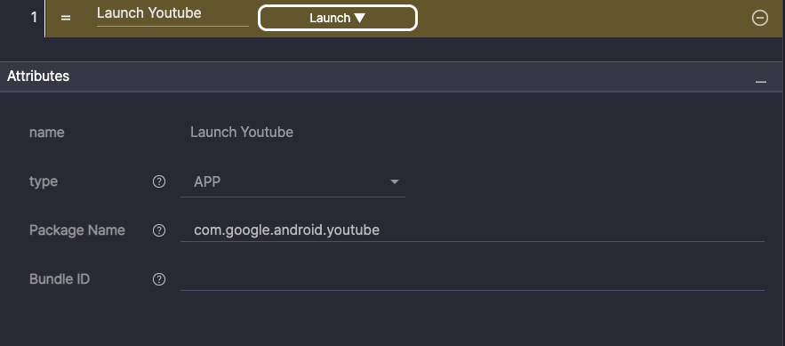 ③ In Attributes, enter the exact Package Name (Android) or Bundle ID (iOS) of the app to run.