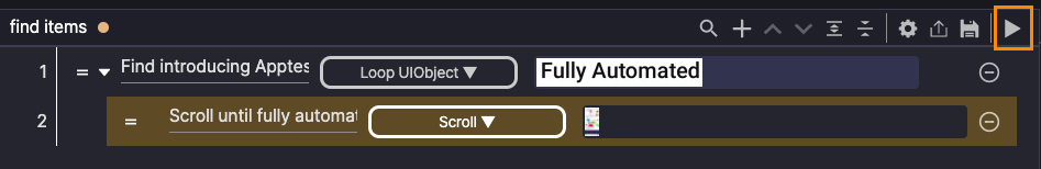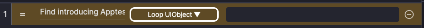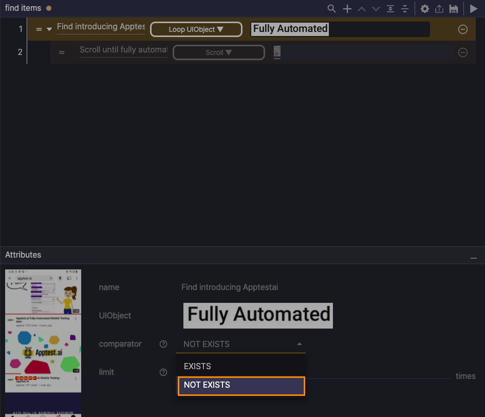 Step 6. Select the Loop UIObject step and open the Attributes panel. Set the comparator to NOT EXISTS so the step continues scrolling until the target video appears.