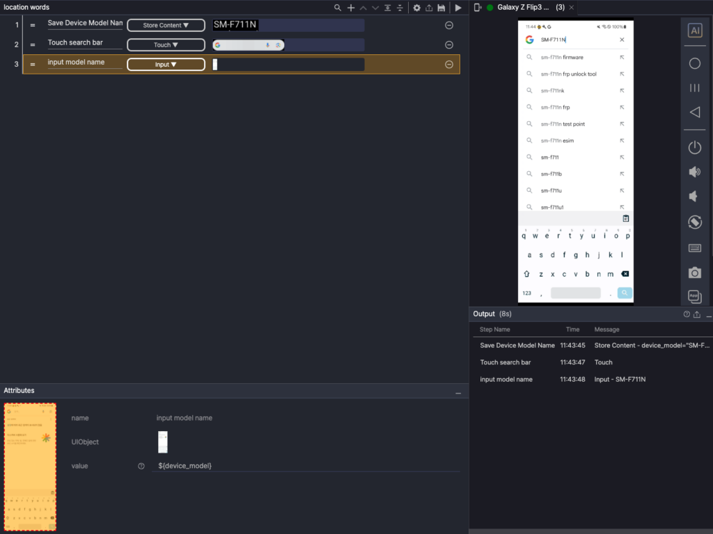 Step 5. Add an “Input” step and set “Attributes › Value” to ${device_model}.