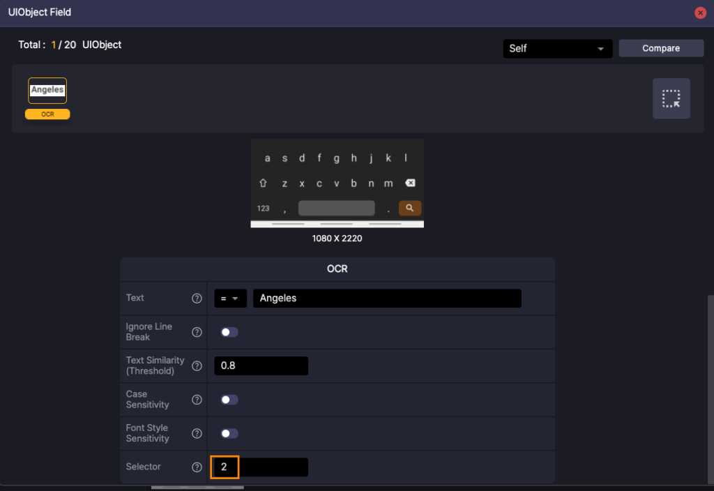 Step 5. Add a Touch step. Set Analysis Strategy to OCR, then drag and drop “Angeles” to the UIObject field.