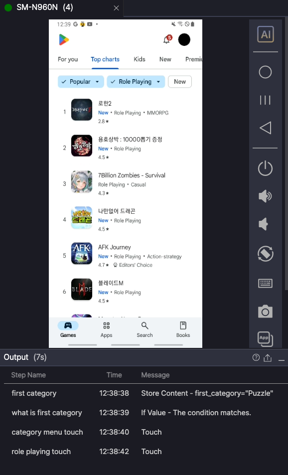 - Child 2: Add a Touch step for “Role Playing” in the Categories selection window (same method).