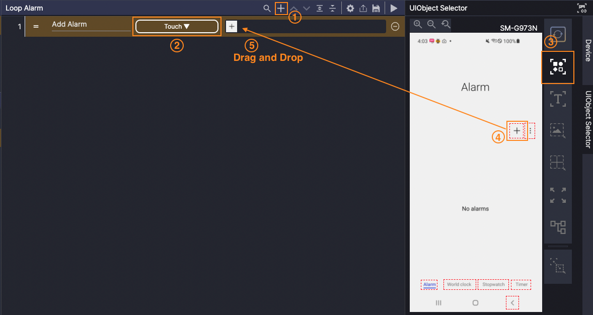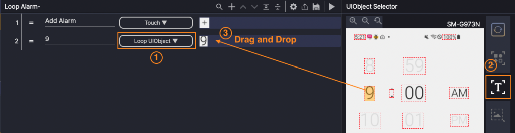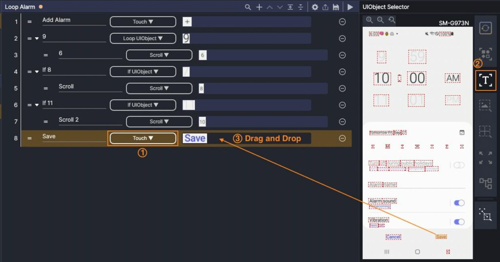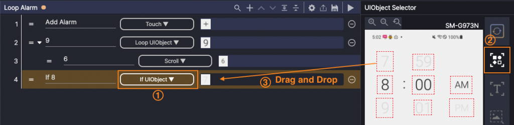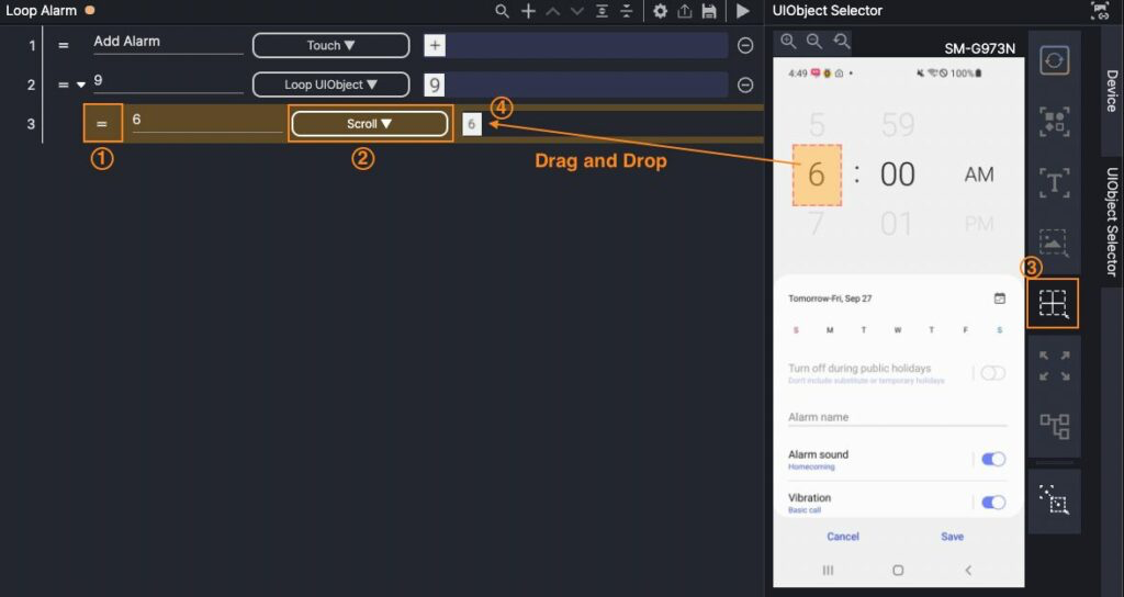 Set a desired alarm time in the Android Clock app. Use “Loop UIObject” and “If UIObject” to adjust the time picker.