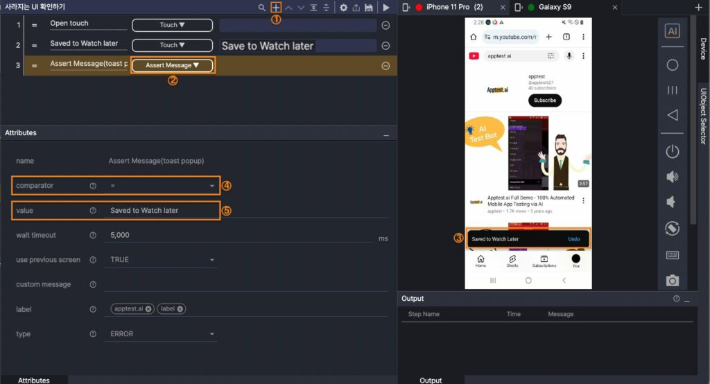 then drag and drop the screen into the “UIObject” field. Enter “YouTube” in the value field.