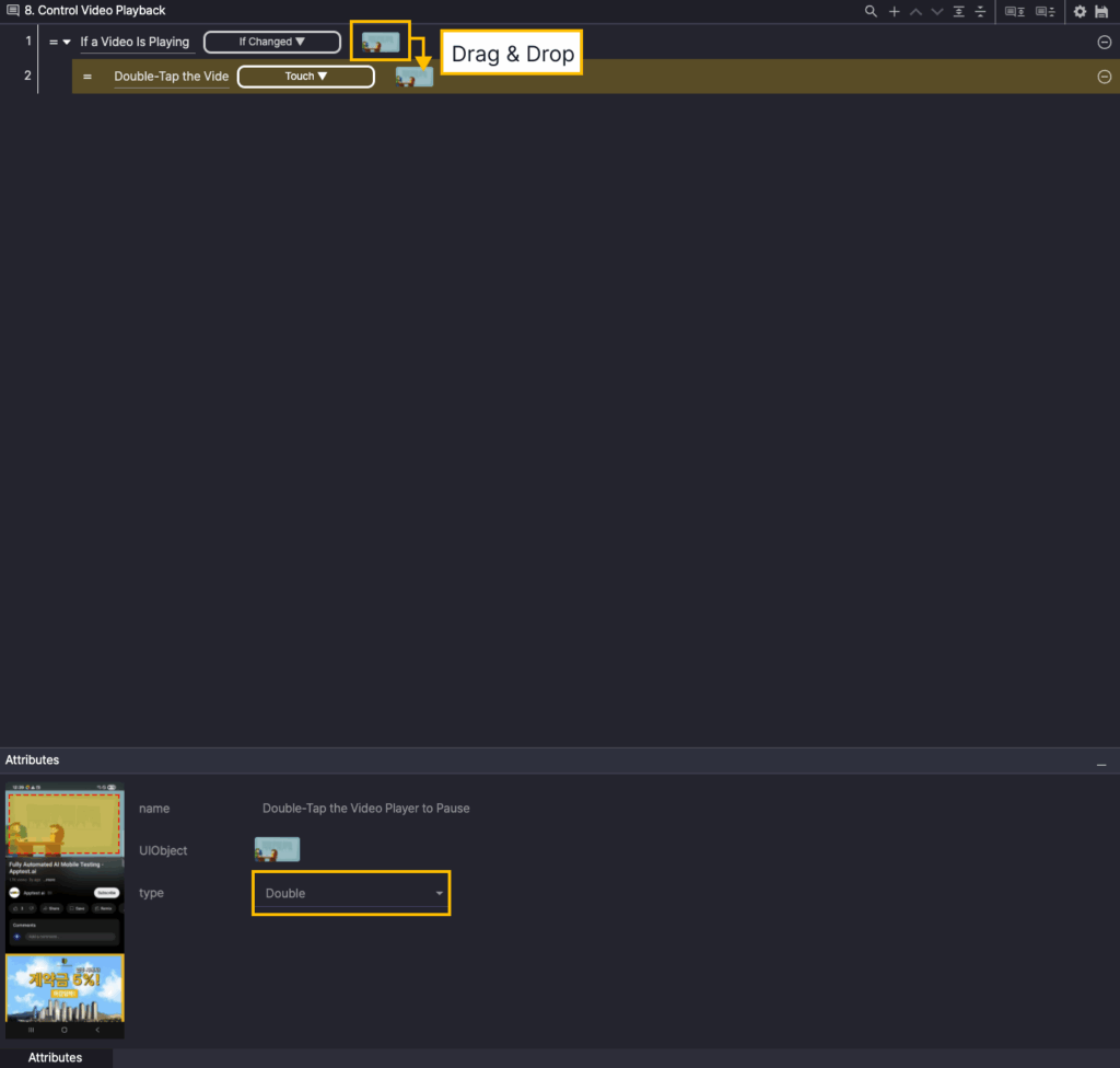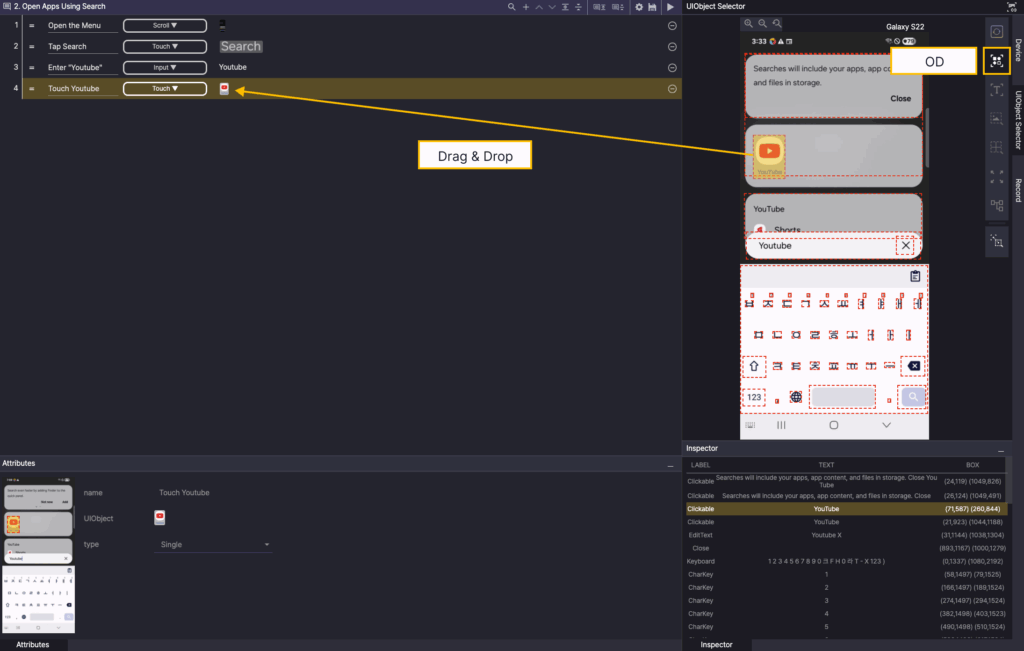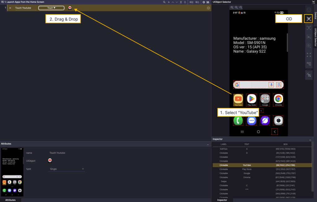 Step 2. Select the Touch action from the created step and add the UIObject from Step 1 as the UIObject from Step 2.