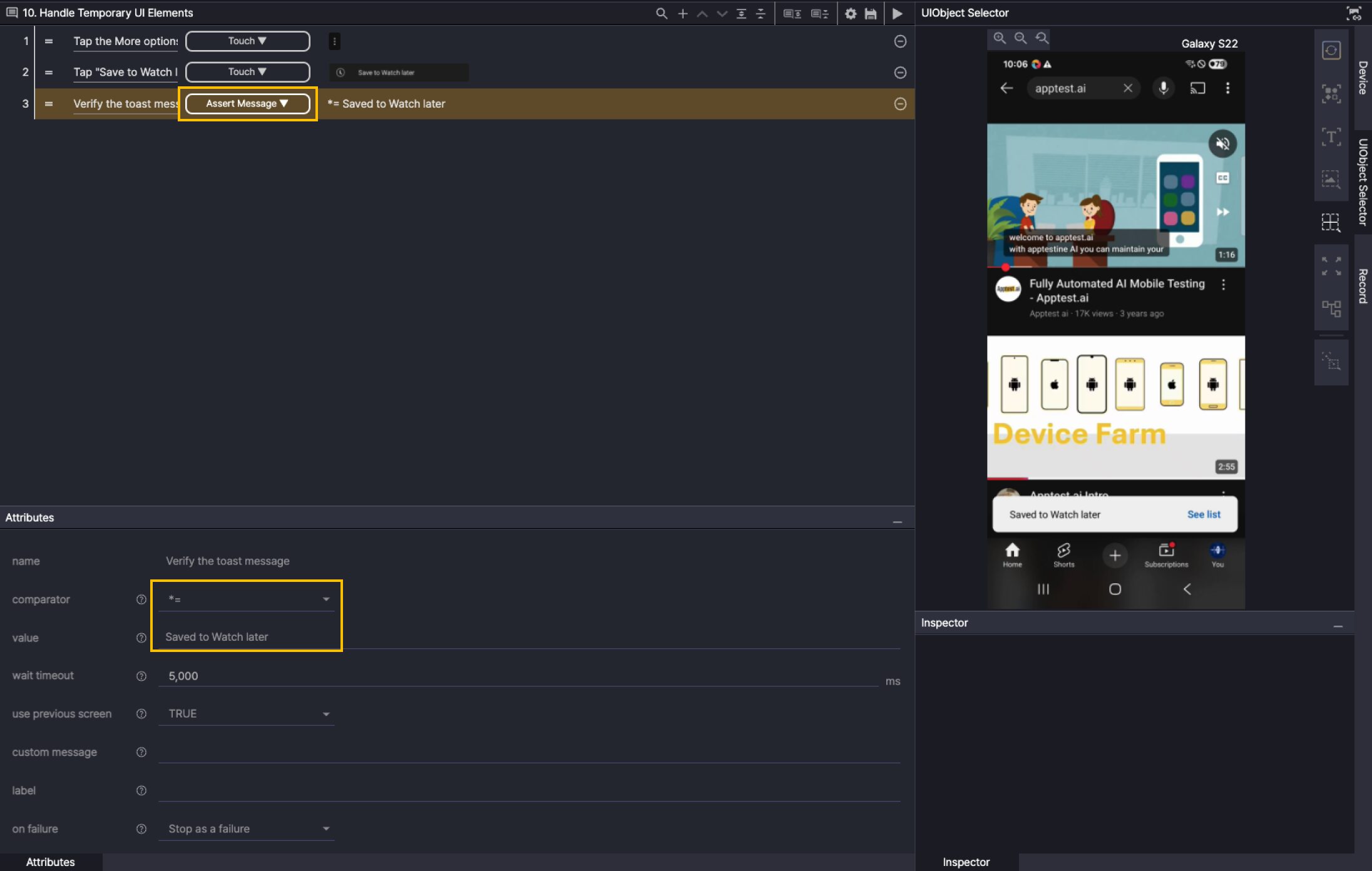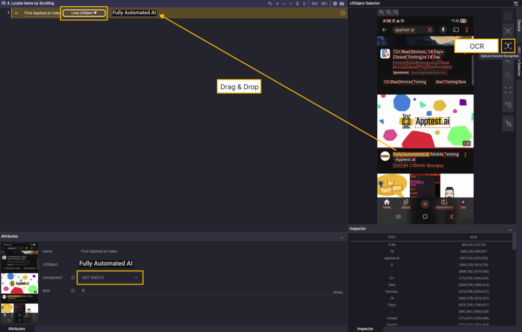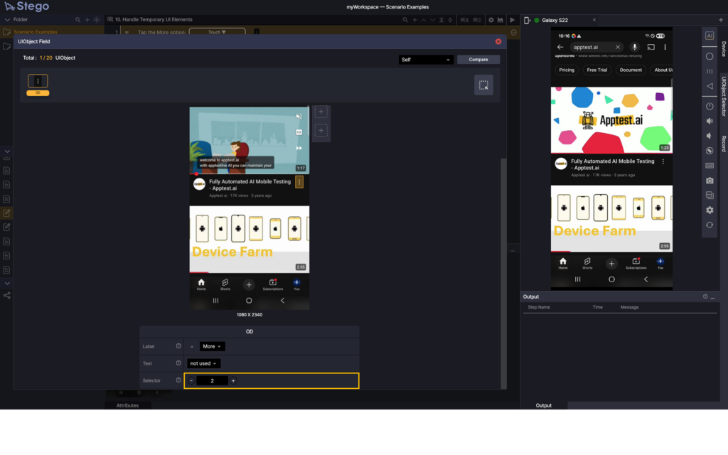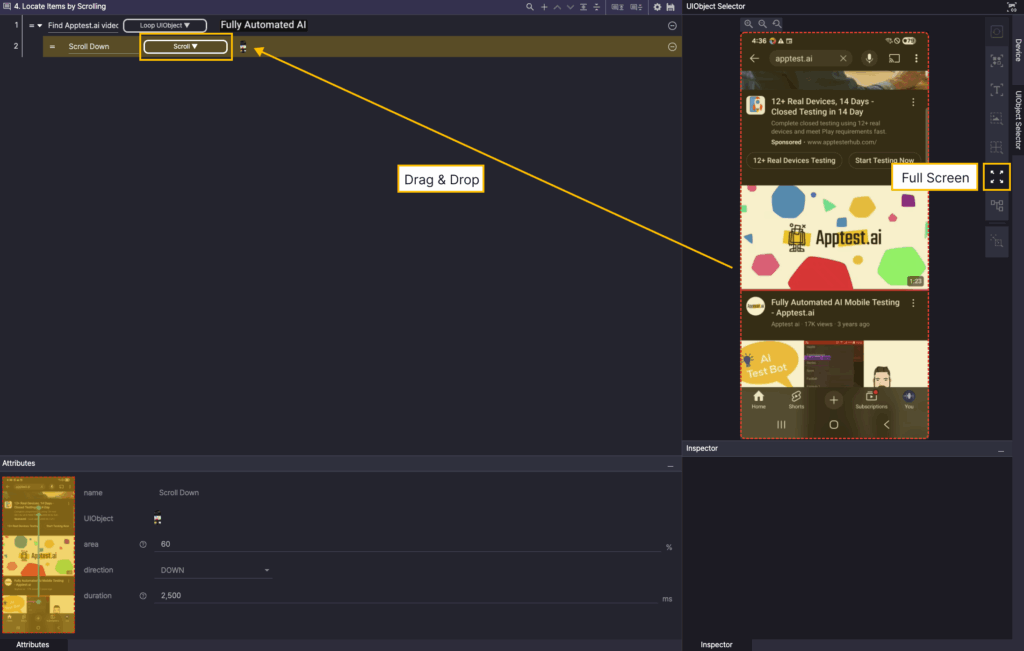 An example scenario that scrolls through YouTube search results until the Fully Automated AI Mobile Testing – Apptest.ai video appears.