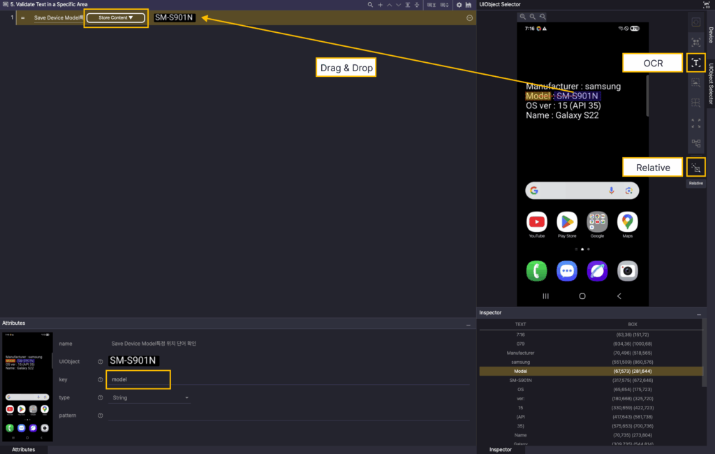 In the Screen Analysis tool, select OCR, and then specify the Model OCR for the device screen. Then select Relative, and drag the area where the model name is exposed to add that area as a UIObject.