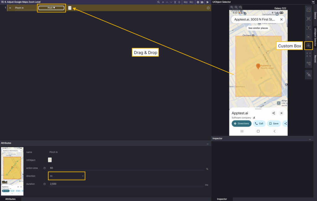 In the Screen Analysis tool, select Custom Box, and then drag the area where you want to perform the Pinch In action to add it as a UIObject.