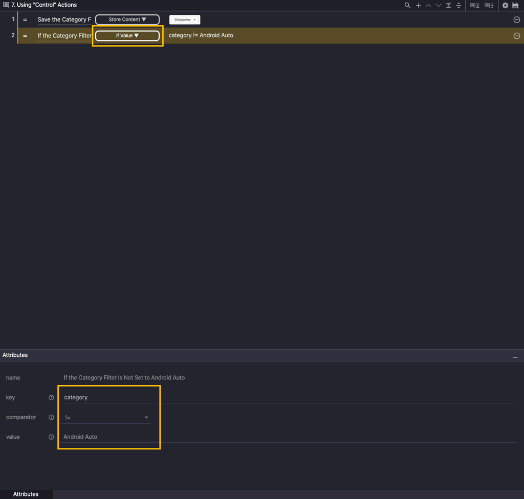 If the value stored in category is not Android Auto, the child step of the If Value action is executed.