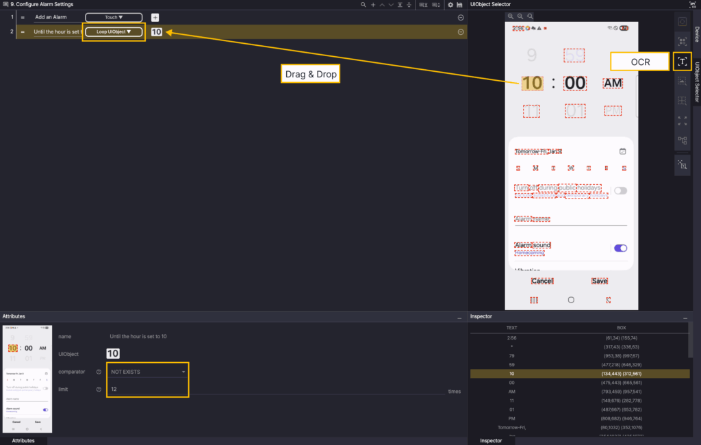 Step 4. Create a new step and select the Loop UIObject action. Specify the comparator of the Attributes as NOT EXISTS, and enter 12 for limit.