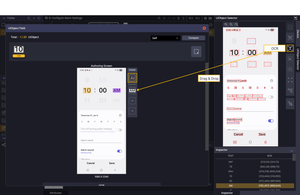 Click the AI button in the UIObject Field, select OCR in the Screen Analyzer tool, and add AM OCR as an Anchor.