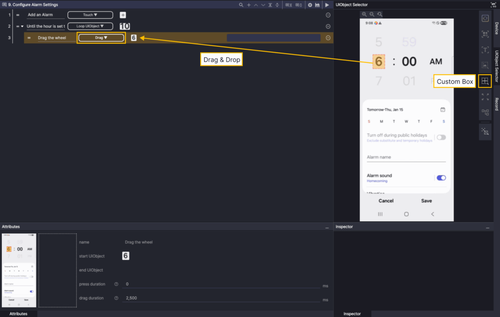 This scenario is an example of an Android clock app where the user sets the desired alarm time. You can use Loop UIObject to learn how to adjust the alarm time.
