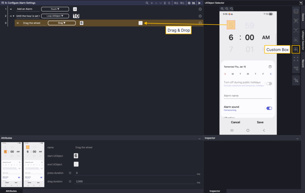Select the Custom Box in the Screen Analysis tool, and then drag the drag to the destination area to add it as the end UIObject in Step 3.