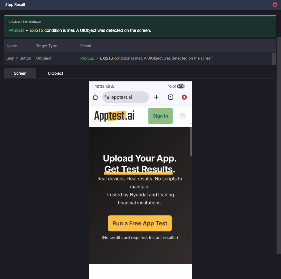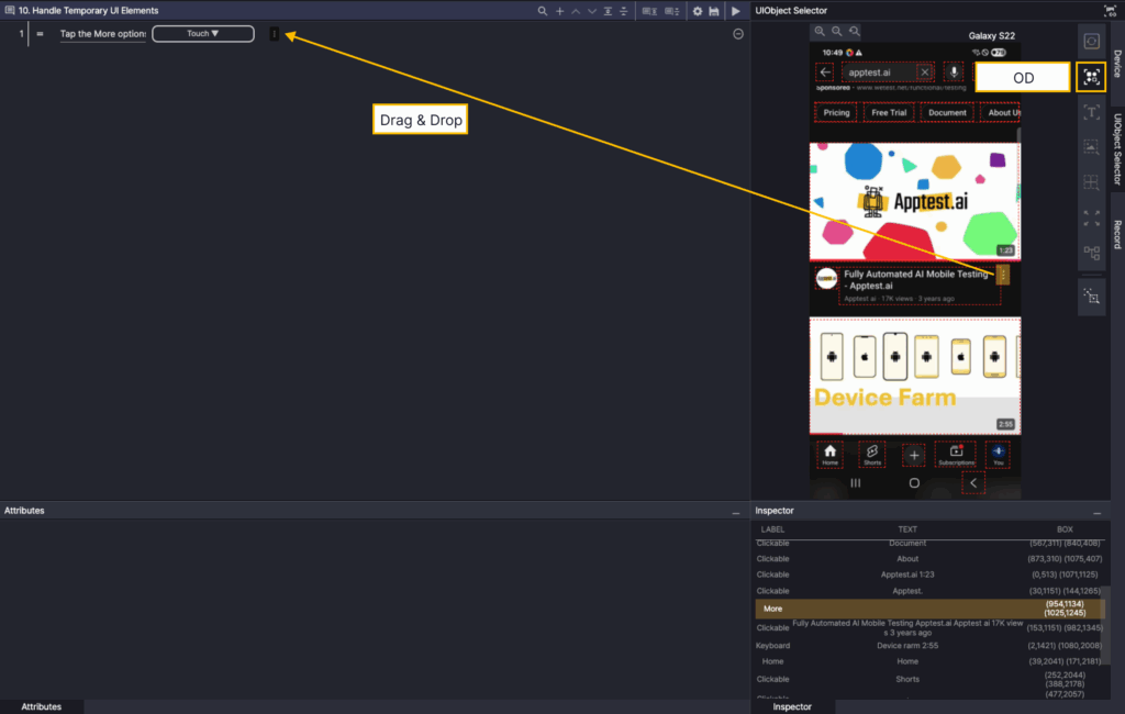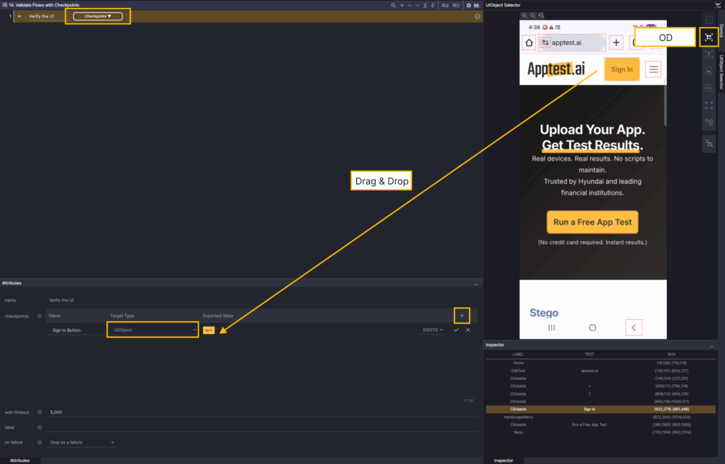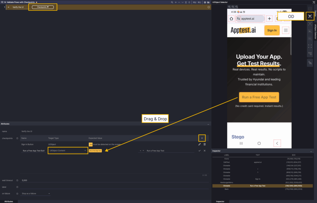 In the Screen Analyzer, select OD and add the Run a Free App Test button object as a UIObject.