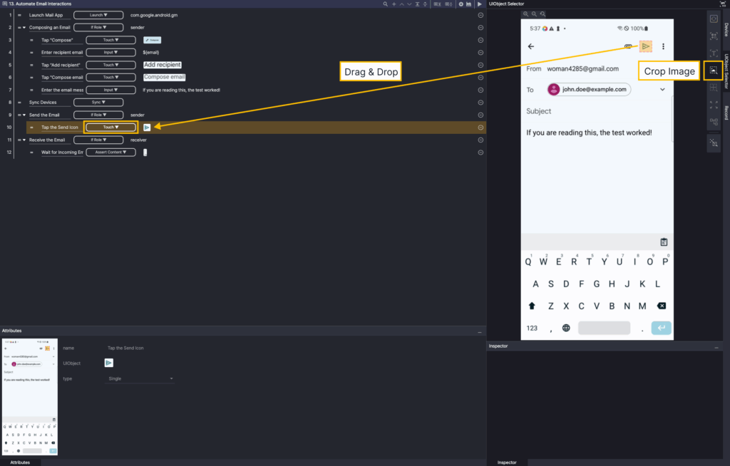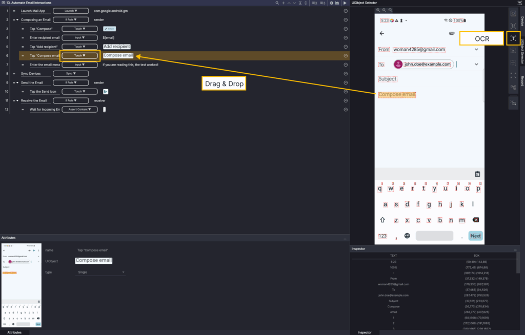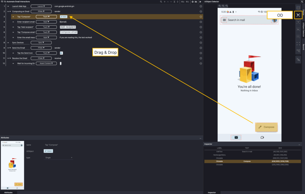 Step 3. Select the Touch action, and in the Screen Analyzer tool, select OD to add the Compose button OD as a UIObject.