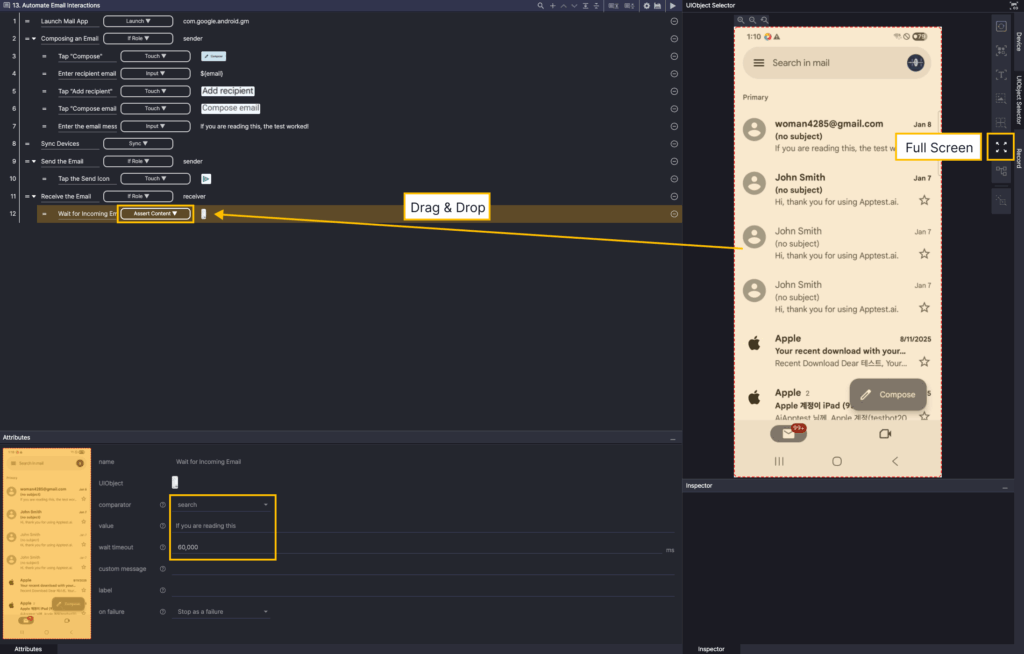Step 4. Select the Touch action from the created step. Add the UIObject from Step 1 as the UIObject from Step 4.