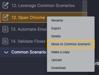 Right-click Open Chrome Scenario in the Scenario panel, and then select Move to Common Scenario to set it to Common Scenario.