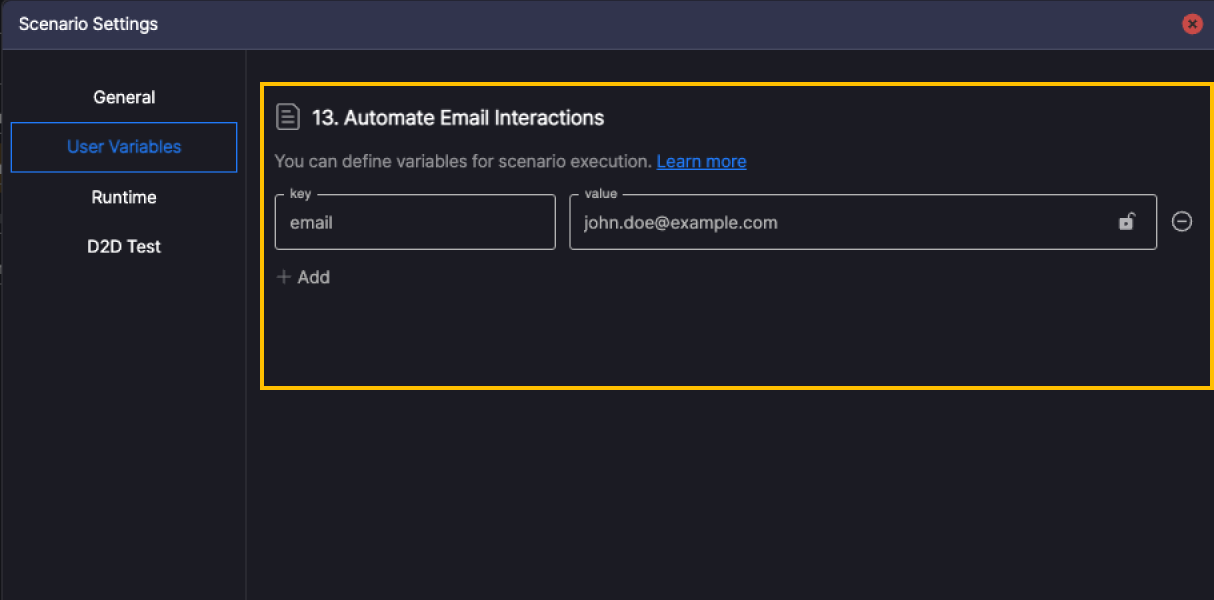When the scenario runs, the value of the email user variable (john.doe@example.com) is entered automatically.