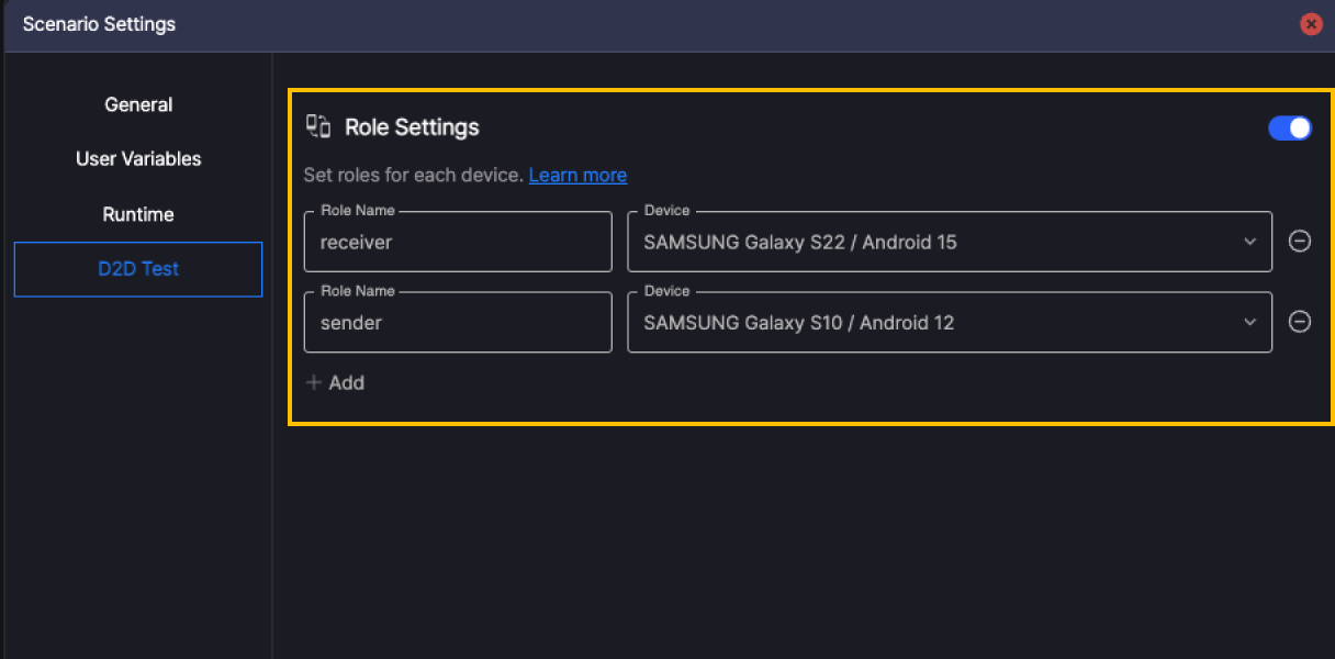 Enable the Scenario Settings > D2D Test entry and define the device role: