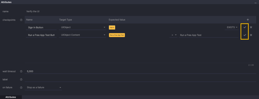 Under Attributes > checkpoints, select the + button to add a checkpoint. Set the Target Type to UIObject.
