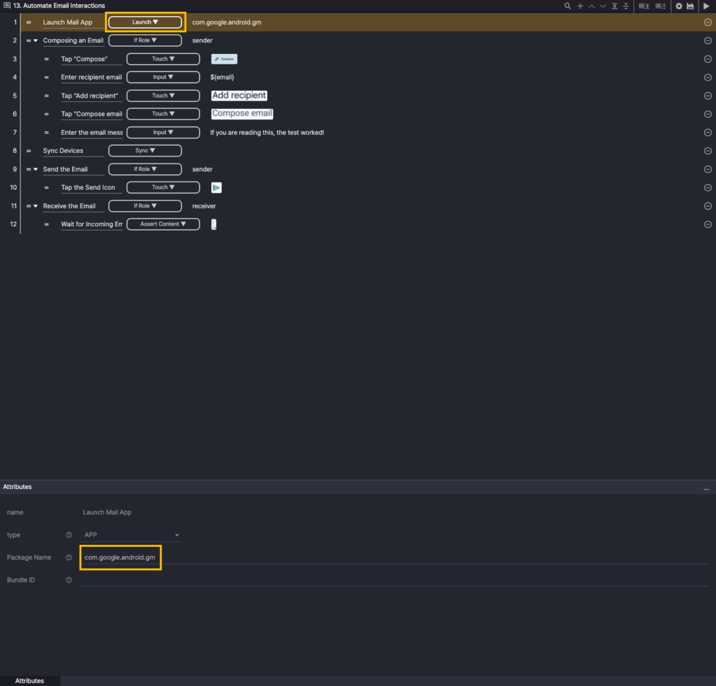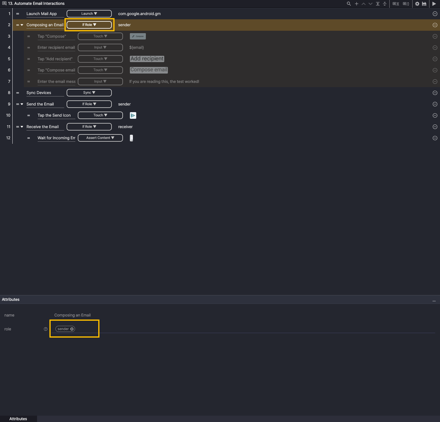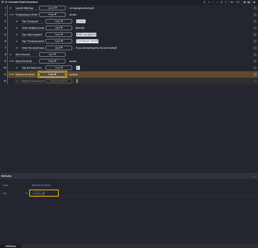 The child step of Step 11 (If Role) is executed only on the receiver device.