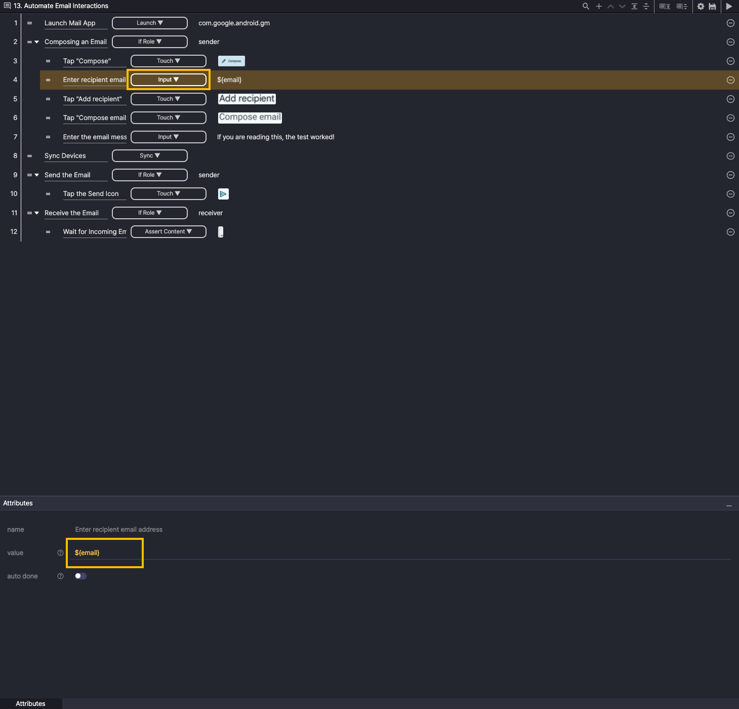 Step 4. Add a new step, and select the Input action. For Attributes, enter ${email} in the value.