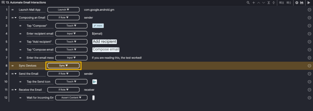 The child step of Step 9 (If Role) is executed only on the sender device.