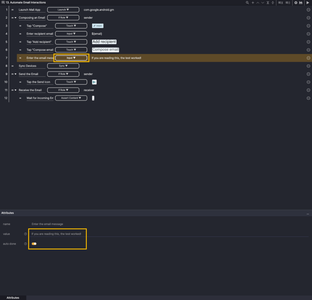 Enter “If you are reading this, the test worked!” in the value field, and enable the Auto Done option.