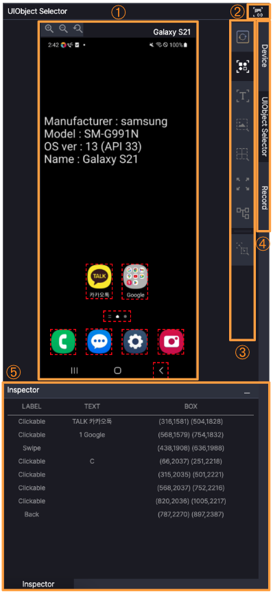 - Switch between Device, UIObject Selector, and Record tabs as needed.